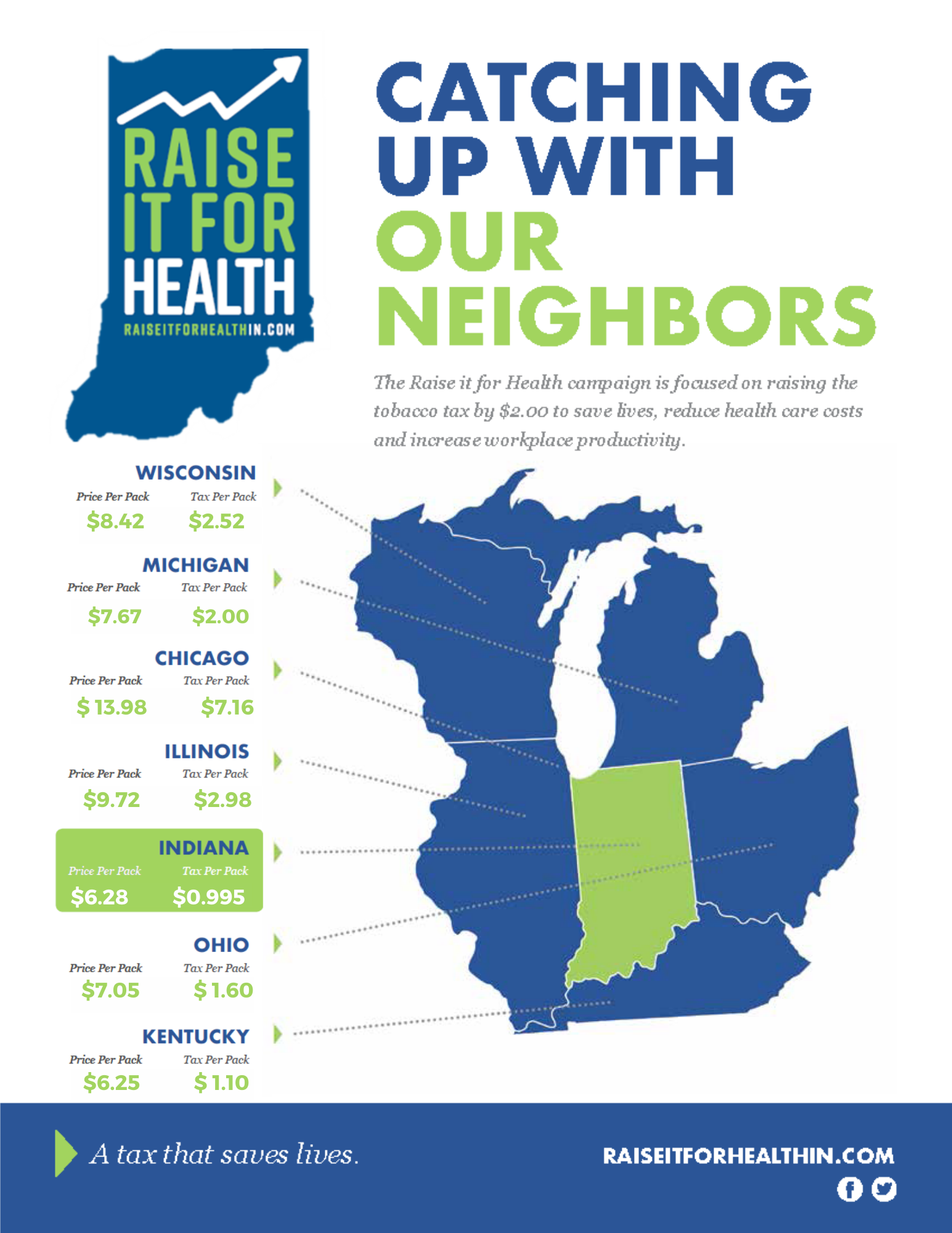 First, lawmakers should know a 50-cent cigarette tax increase would still leave Indiana with a cheaper tax rate than 3 of our 4 neighboring states. And, Ohio and Kentucky have given us lessons in the ineffectiveness of small cigarette tax hikes.